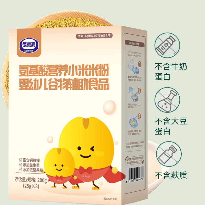 德美嘉米粉為氨基酸配方米粉,不含牛奶蛋白,并且在完全無牛奶蛋白環(huán)境中生產(chǎn)。不含牛奶,膠質及麥麩, 不含有乳糖及雙糖, 特別添加低聚果糖, 強化鐵的添加富含鈣和維生素A D B1,鈣鐵鋅等礦物質含量更接近膳食指南的推薦量。